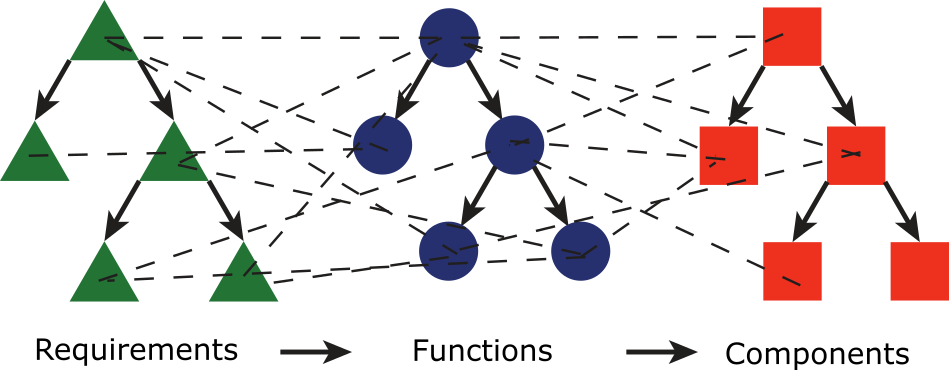 Systems engineering traditionally advocates the use of separate requirement, function, and component trees, as shown in the figure below. Creating dependencies between these trees is done manually. This is a non-trivial, cumbersome and error prone task, which relies heavily on the good-behavior of the modeler to obtain a proper model. Moreover, the neat requirement and function hierarchies often do not exists in real-life. That is, design decisions made during the project often yield new requirements and new functions, which do not fit within the hierarchical structure.