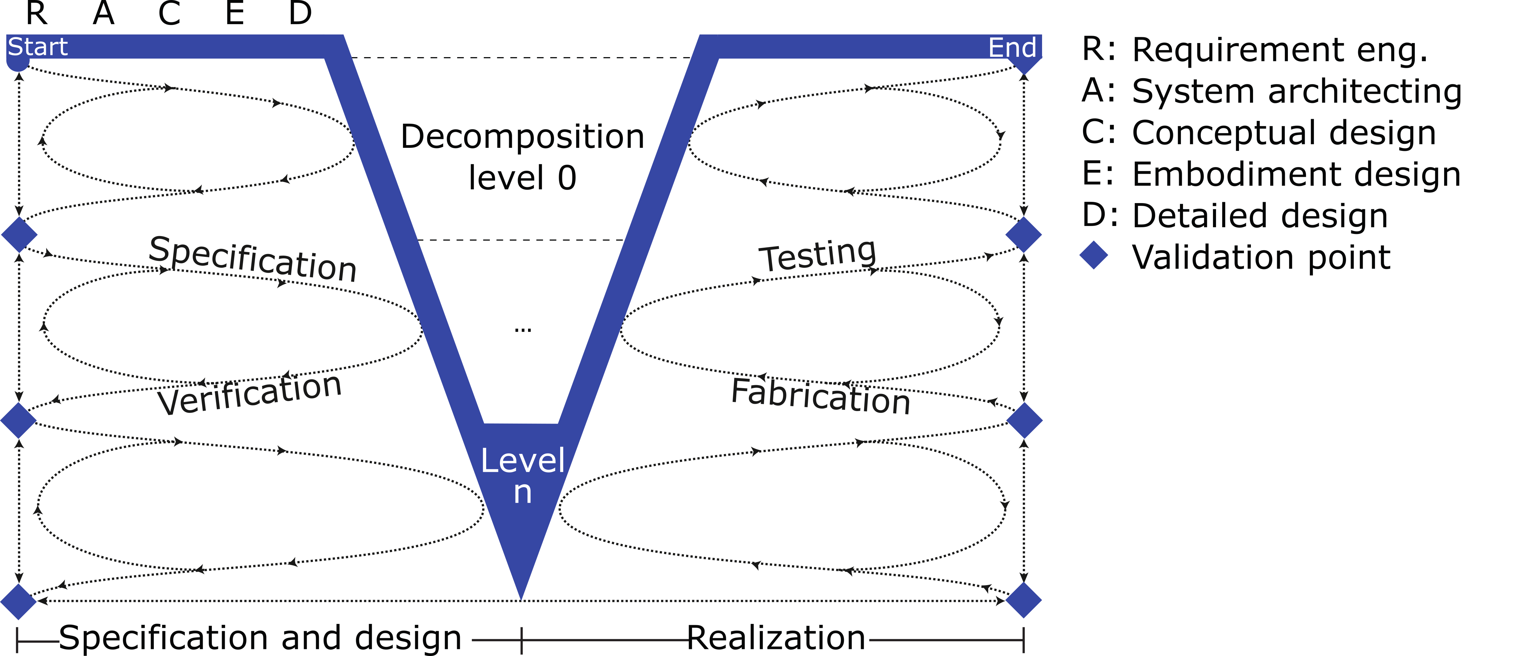 Starting at the top left, the requirements (R) at the highest decomposition level are specified. Next, a basic system architecture (A) is defined that denotes the interactions between the conceptual components. Next, a concept (C), i.e. a working-principle and an embodiment (E) are chosen for each component. During detailed design (D) one aims to verify whether the requirements can be fulfilled given the architectural, working-principle and embodiment choices. If so, the first customer validation point is set to check whether the solution satisfies the customer needs thus far. If not, one has to consider other architectures, concepts and embodiments.