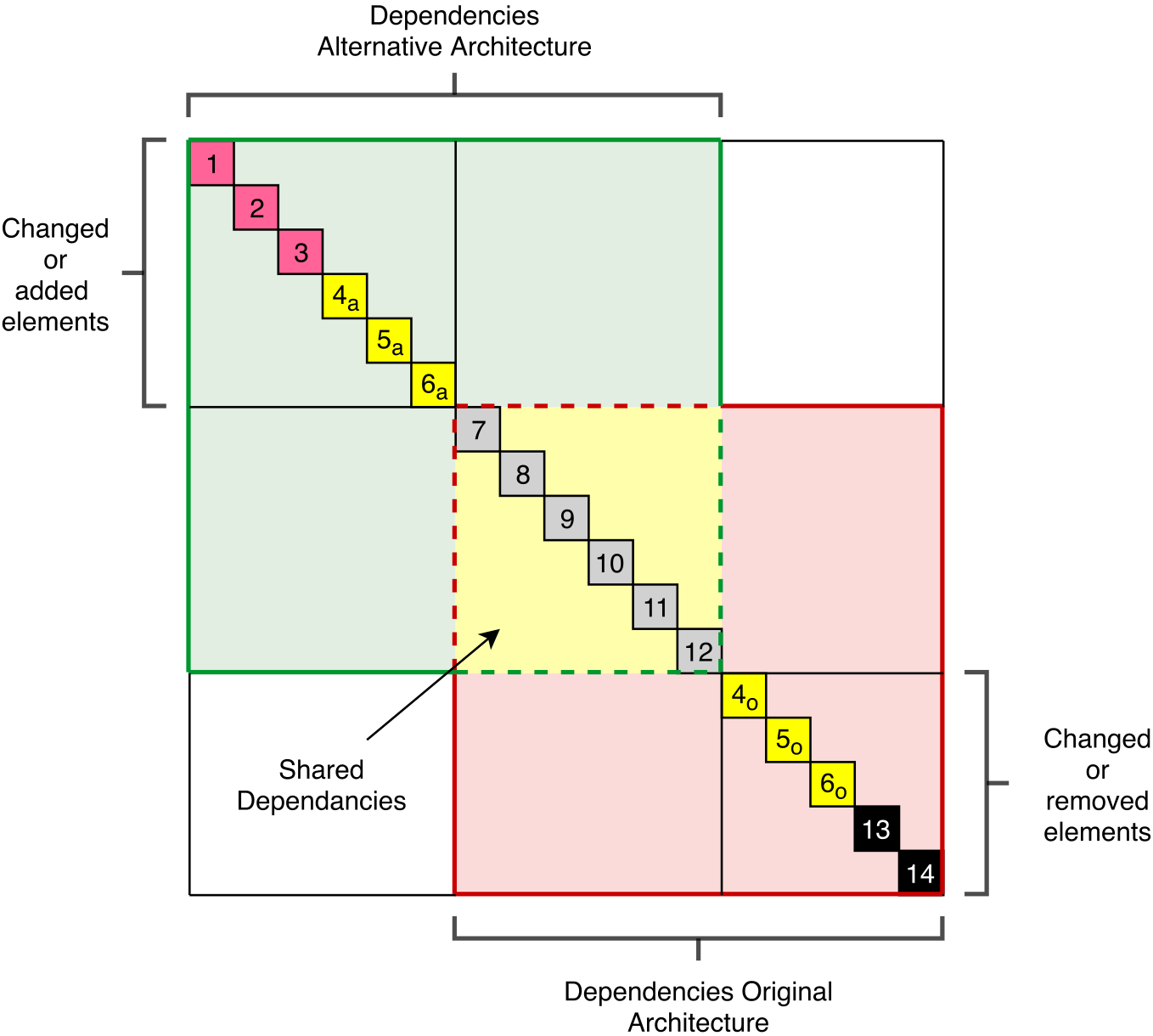 During any design process one has to make many design decisions, that may impact the architecture and performance of the system. To visualize the effect of design choices on the system architecture, one can use a comparison dependency structure matrix (C-DSM) as depicted in the figure below.