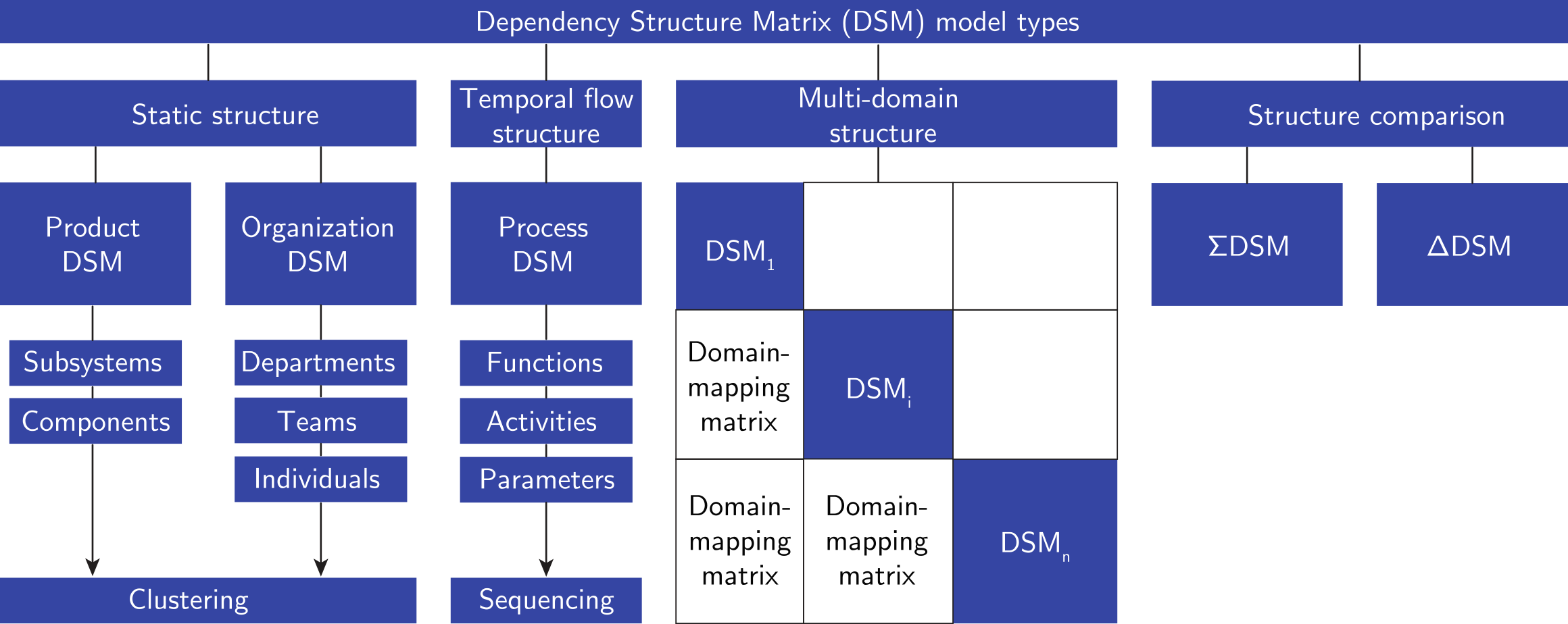 The figure below shows a generalized overview of DSM types. In addition to product and process DSM, one can create organization DSM models, multi-domain-matrix (MDM) models, and structure comparison DSM models.