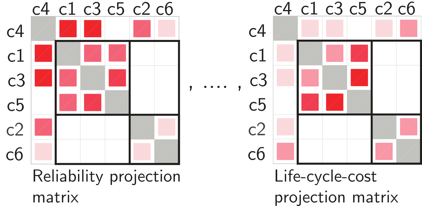 For example, this figure shows a regular DSM on which reliability (left) and life-cycle-costs (right) impact estimates are projected. These estimates may be a simple low impact (1), medium impact (3) or high impact (9) rating. The brighter the shade of red, the greater the impact of that combination of components on the respective KPI. The reliability P-DSM on the left shows that the combination of components \(c_4\), \(c_1\) and \(c_3\) has the greatest impact on the reliability of the system. The life-cycle cost (LCC) P-DSM shows that the combination of components \(c_1\), \(c_3\) and \(c_5\) has the greatest impact on (LCC). The P-DSMs clearly show the area of interest regarding the respective KPI.