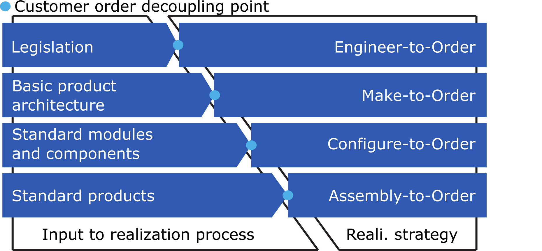 The figure below shows several realization strategies in relation to the input required for the realization of a product using each strategy. An Engineer-to-Order strategy only requires legislation and customer requirements as input. Subsequently, each product is re-engineered. An Assembly-to-Order strategy requires standard products and customer requirements as input. Subsequently the standard product that best fits the customer requirements is assembled.