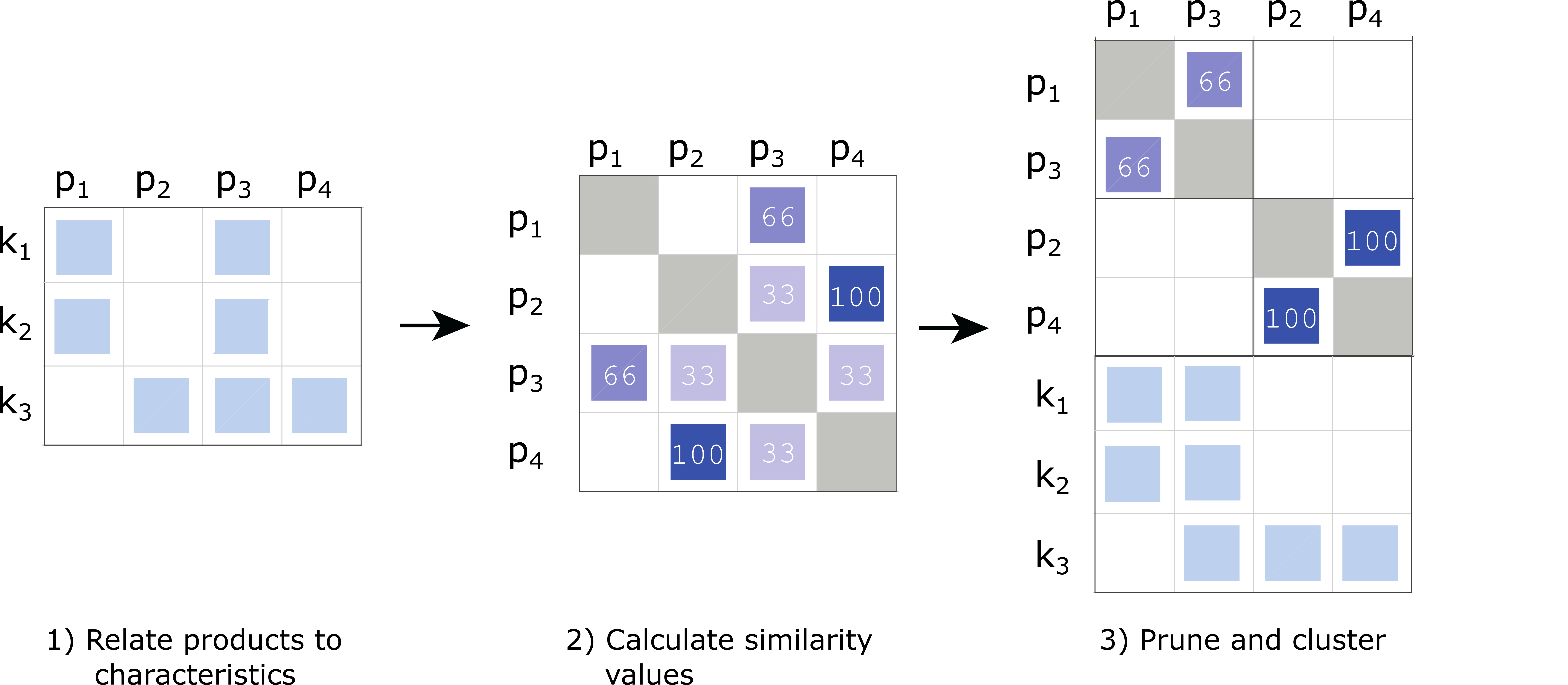 First, one has to build a binary characteristic mapping matrix M, relating characteristics \(k_i\) to products \(p_i\). Next, one can calculate a product similarity matrix S, indicating how similar two product are based on the selected characteristics. The third step comprises the pruning of S, joining it with M and reordering the matrix with a cluster algorithm. The result provides groups of similar products and shows which characteristics they possess. Here, the products in the first group possess \(k_1\), \(k_2\) and possibly \(k_3\). Products in the second group only possess \(k_3\).