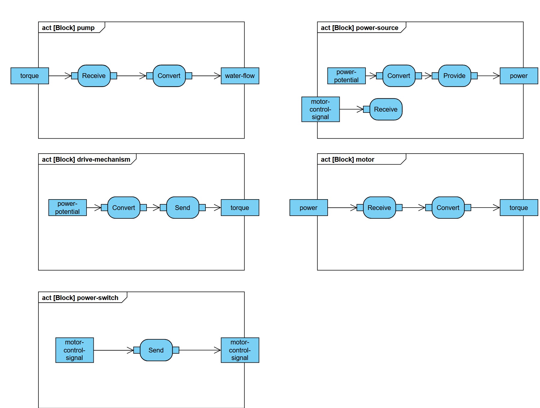 The action of the goal-requirement is mapped the Activity Diagram of both the sender (power-source) and the receiver (motor). The action of the sender is provide and the action of the receiver is receive. The input and output pins of both actions have the FlowProperty power.