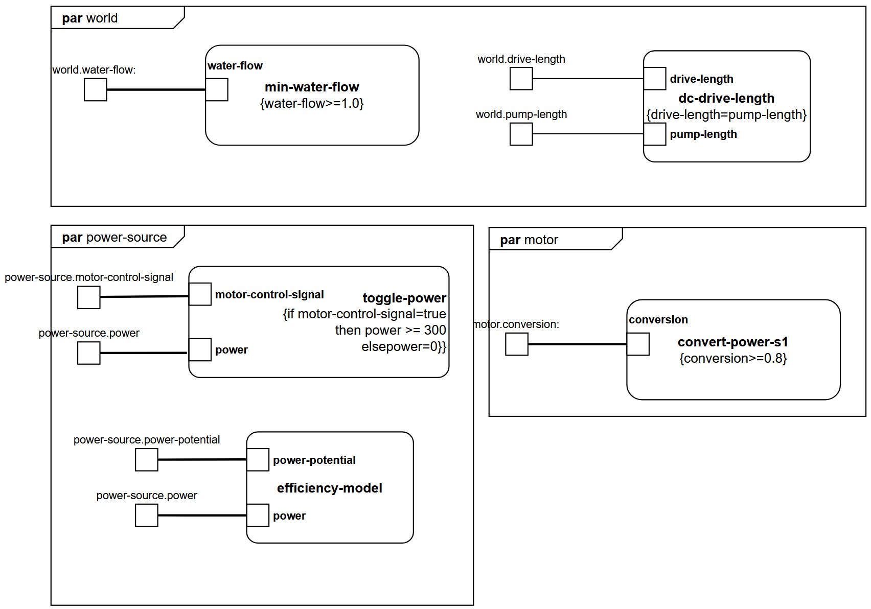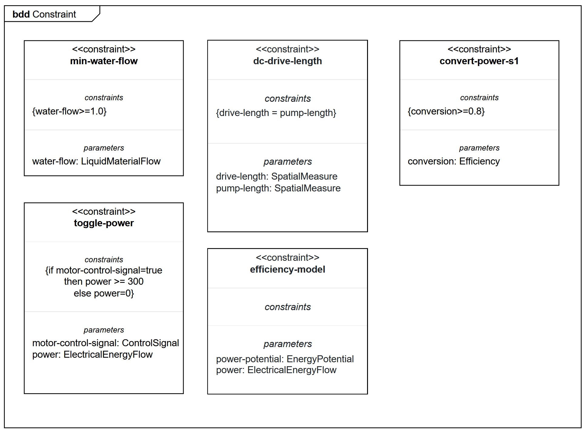 The design-requirements, design-constraints, behavior-requirements and relations are captured as constraint definitions in a Block Definition Diagram. Afterwards, they are instantiated in a Parametric Diagram. The constraint definition can include bounds on values. This is specifically useful for mapping (in)equality design requirements. min-water-flow, dc-drive-length and convert-power-s1 are examples of inequality design requirements, as shown in the example below. The constraint definition can also be empty, save for parameters as in efficiency-model, to visualize relations. If/then statements can be used to map behavior-requirements, as in toggle-power.